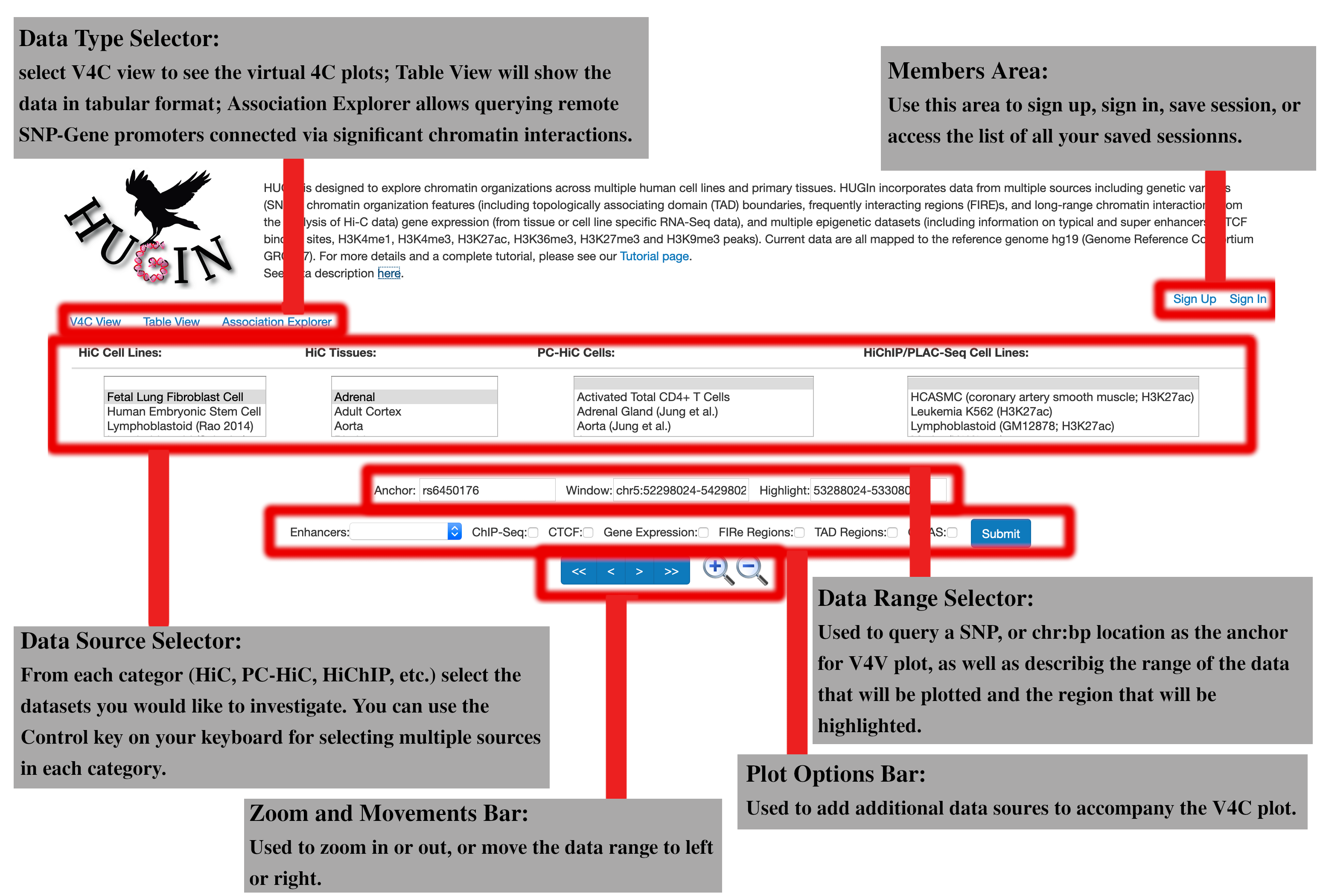 HUGIn is designed to explore chromatin organizations across multiple human cell lines and primary tissues. HUGIn incorporates data from multiple sources including genetic variants (SNPs), chromatin organization features (including topologically associating domain (TAD) boundaries, frequently interacting regions (FIRE)s, and long-range chromatin interactions from the analysis of Hi-C data) gene expression (from tissue or cell line specific RNA-Seq data), and multiple epigenetic datasets (including information on typical and super enhancers, CTCF binding sites, H3K4me1, H3K4me3, H3K27ac, H3K36me3, H3K27me3 and H3K9me3 peaks). Current data are all mapped to the reference genome hg19 (Genome Reference Consortium GRCh37). For more details and a complete tutorial, please see our